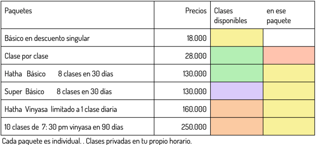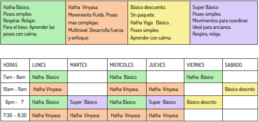 Las clases básicas son a las 6pm y duran una hora. Llega, por favor, unos minutos antes. Sin embargo, si ese horario no te conviene, escoge otra clase en el horario y te ofrecemos modificaciones para tu nivel. Las clases son presenciales o virtuales? Si cualquier día requieres el enlace, no es sino que nos lo pidas.