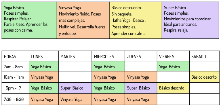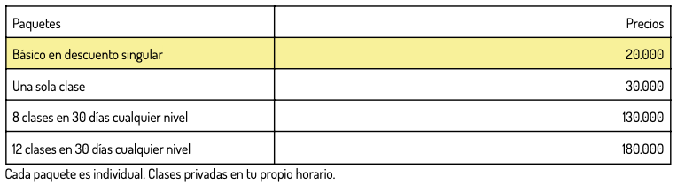 Las clases básicas son a las 6pm y duran una hora. Llega, por favor, unos minutos antes. Sin embargo, si ese horario no te conviene, escoge otra clase en el horario y te ofrecemos modificaciones para tu nivel. Las clases son presenciales o virtuales? Si cualquier día requieres el enlace, no es sino que nos lo pidas.